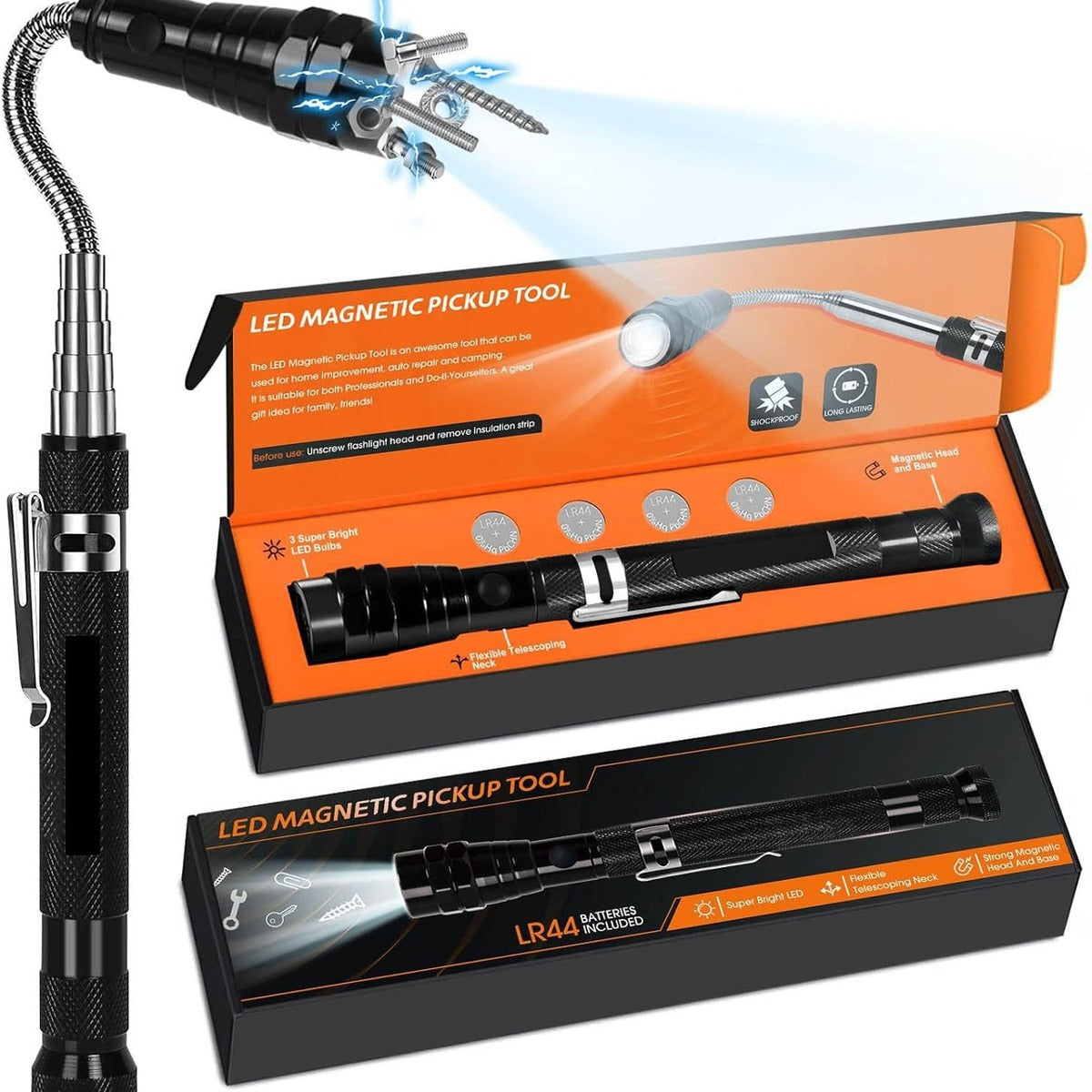 Illuminate dark corners and retrieve metal objects effortlessly with our 360° Rotating Telescoping LED Magnetic Pickup Tool. Perfect for DIY repairs, automobile maintenance, camping, and outdoor work.
